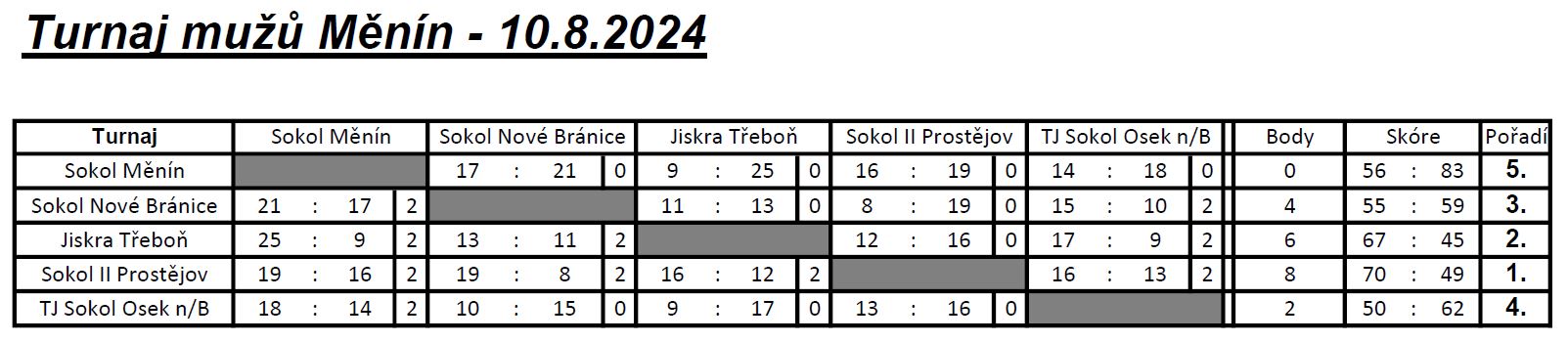 V sobotu 10. srpna odehráli muži v rámci přípravy na nadcházející nový soutěžní ročník turnaj v Měníně. Potkali se druholigovými družstvy Jiskra Třeboň, Sokol Nové Bráníce a Sokol II Prostějov a domácím Měnínem, který se účastní Jihomoravské ligy.